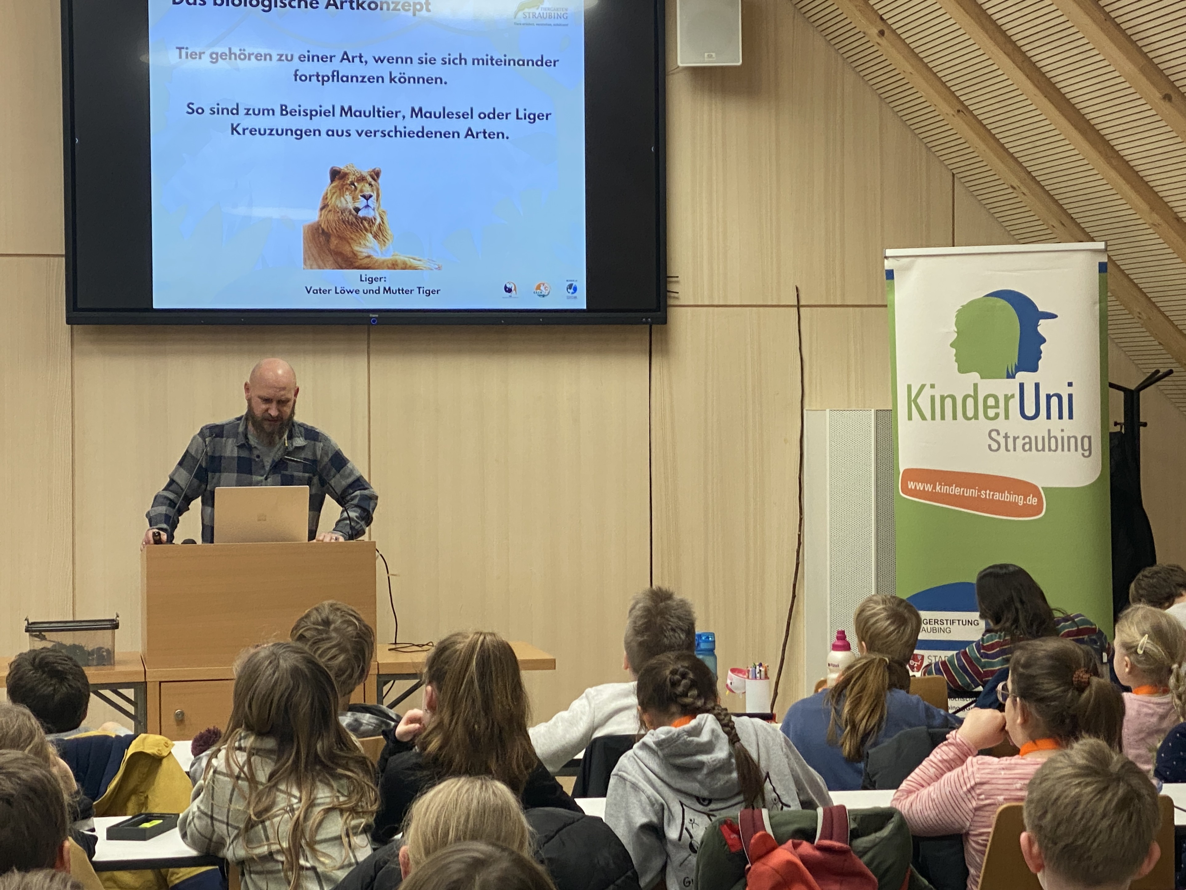 Die KinderUni ist ein mit Kindern und Jugendlichen gefüllter Vorlesungsraum, in dem ein Professor als „Löwenbändiger“ einer wissenshungrigen Meute gegenüber steht.